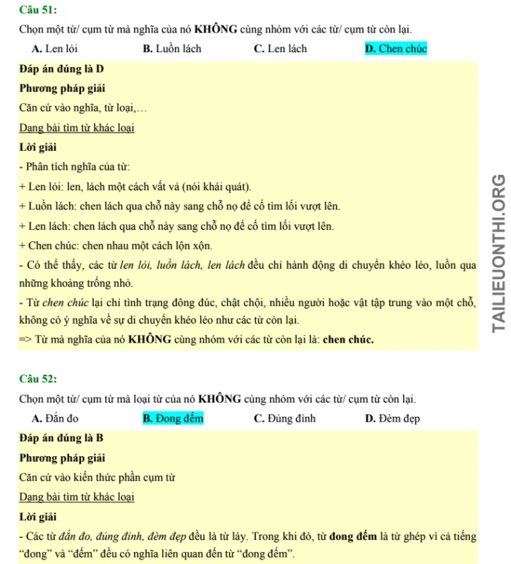 | Ngôn ngữ và Từ vựng | Các câu hỏi yêu cầu xác định từ/cụm từ không cùng nhóm về nghĩa hoặc loại từ (Câu 51-55), điền từ thích hợp vào chỗ trống (Câu 56-60), và tìm lỗi sai về ngữ pháp, ngữ nghĩa, logic (Câu 61-65). |