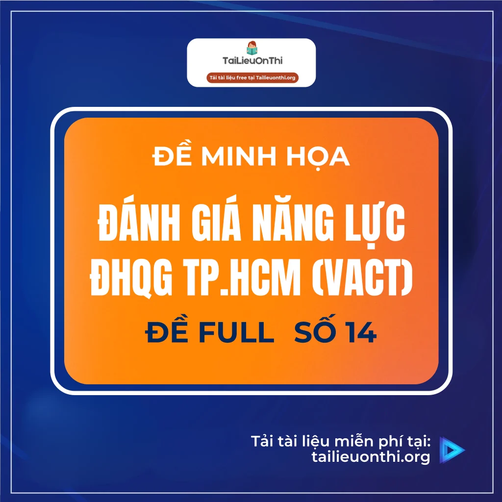 Nhằm giúp thí sinh có sự chuẩn bị tốt nhất cho kỳ thi Đánh giá năng lực TP.HCM (V-ACT) 2025, chúng tôi giới thiệu Đề minh họa số 14 (đề full) kèm lời giải chi tiết. Đây là tài liệu hữu ích giúp bạn rèn luyện kỹ năng làm bài và làm quen với định dạng đề thi chính thức. Ngoài ra, các bạn có thể tham khảo toàn bộ tài liệu ĐGNL HCM ở web nhé.