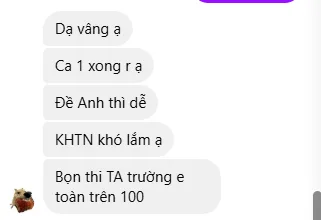 Ca 1 xong r ạ. Đề Anh thì dễ. KHTN khó lắm ạ. Bọn thi TA trường e toàn trên 100