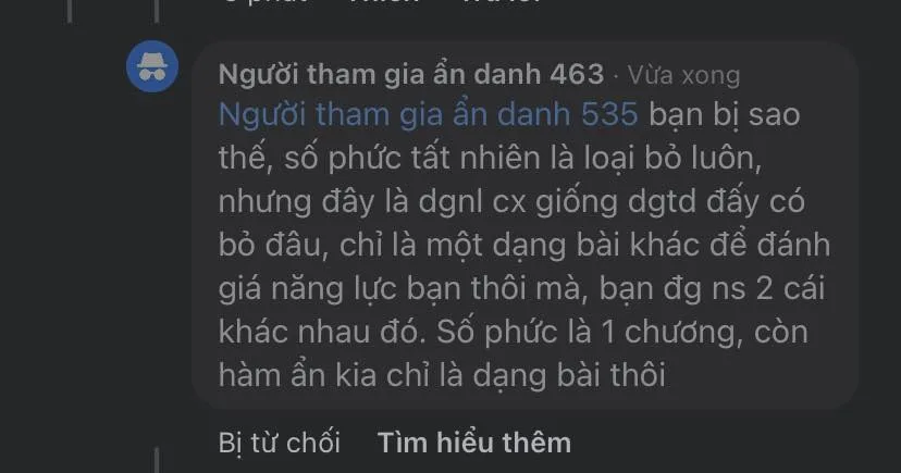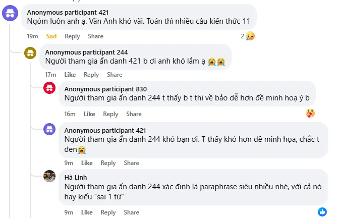 Thật chí đề mình có có 4 câu xuất hiện trong đề minh hoạ đã ra. Có nhiều bài còn lấy từ đề của các gv ôn luyện trên mạng, nếu có mình t thì k nói nhưng mấy đứa bn t cũng thi anh và nhận xét v. Nhóm bn t thi toàn 40+ anh mà trình tụi t thì ở mức khá, mà cái sốc là t ngồi cạnh 1 bn cũng thi anh và đề của tụi t có 1 bài đọc trùng cmn với nhau á