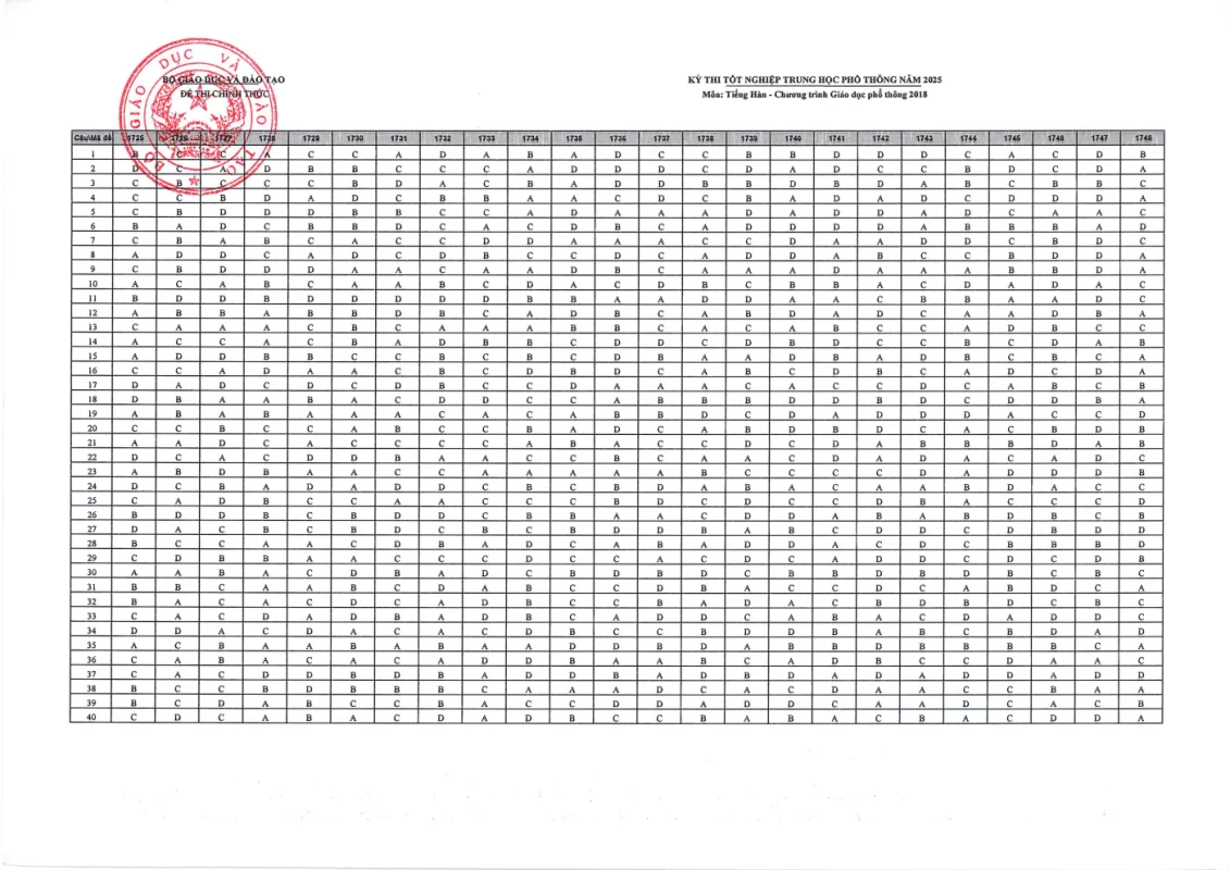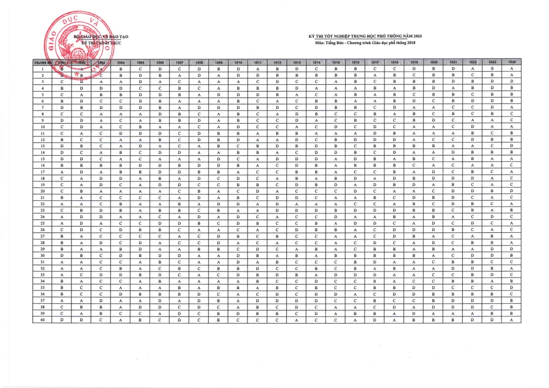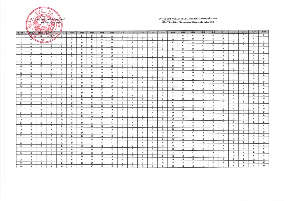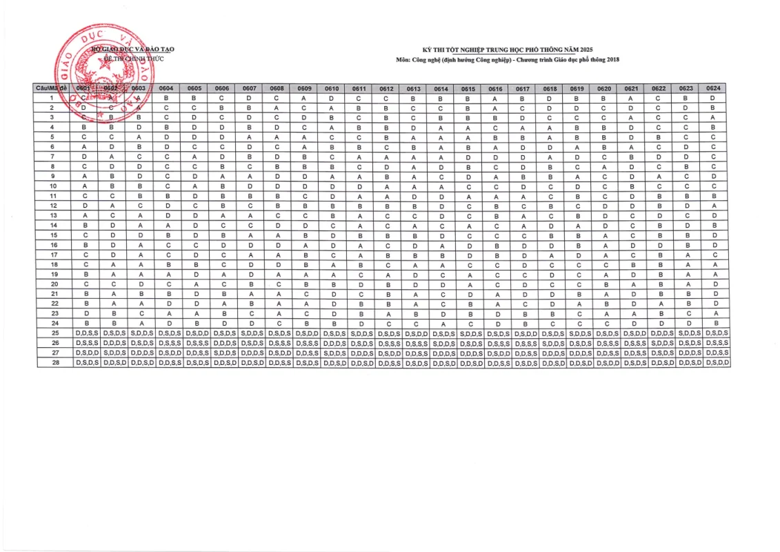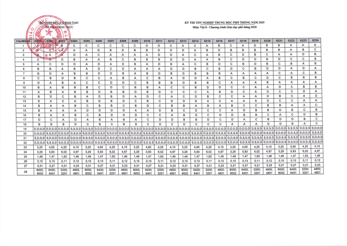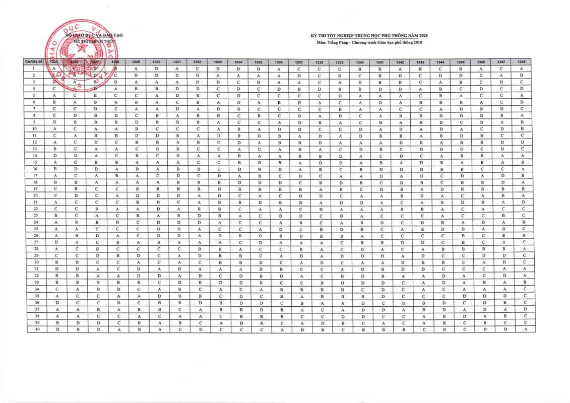 Cập nhật đáp án chính thức các môn thi Kỳ thi Tốt nghiệp THPT 2025 nhanh và chính xác nhất từ Bộ GD&ĐT. Tra cứu đáp án chi tiết từng môn: Toán, Văn, Anh, Lý, Hóa, Sinh, Sử, Địa,….