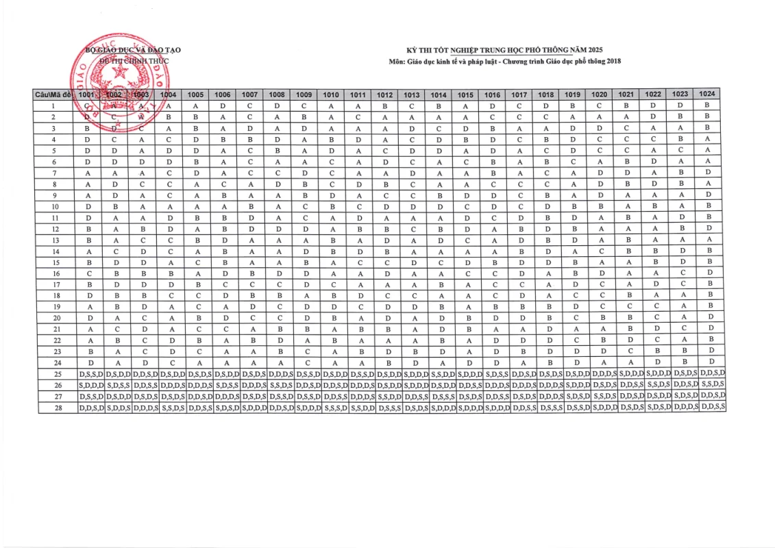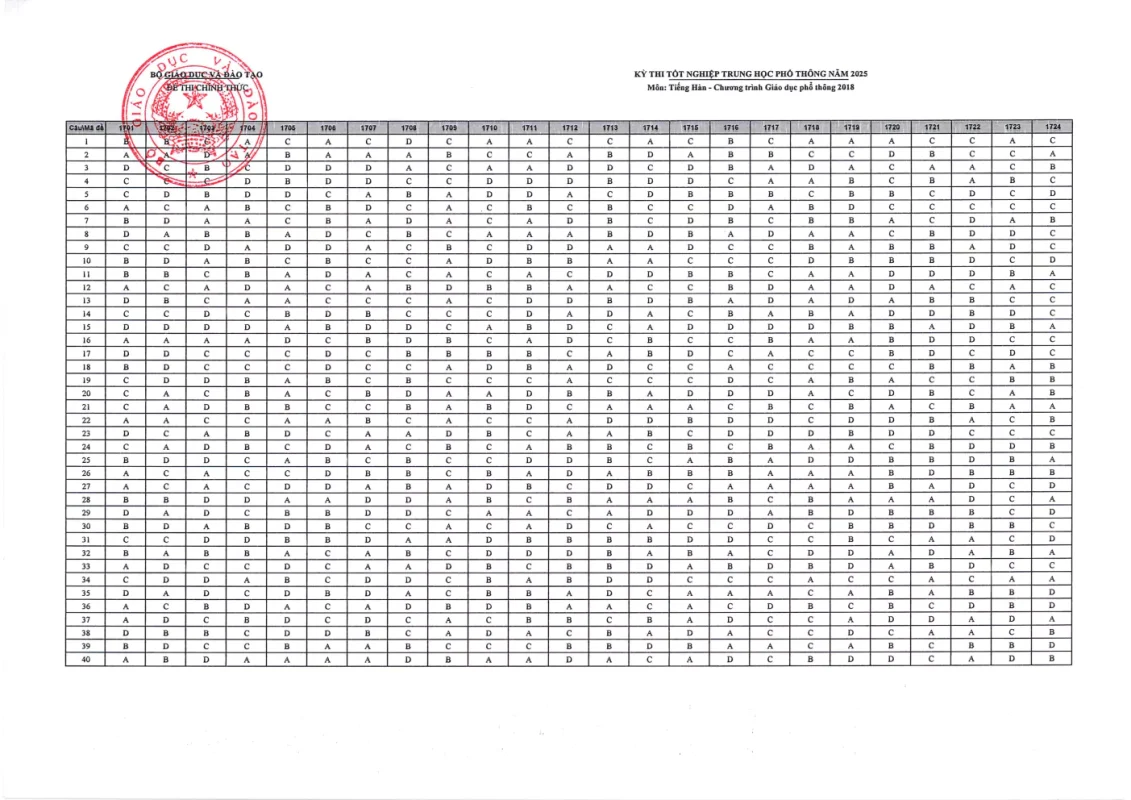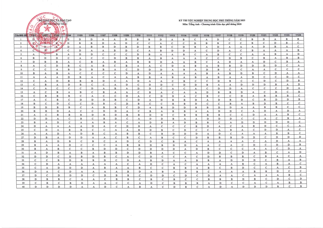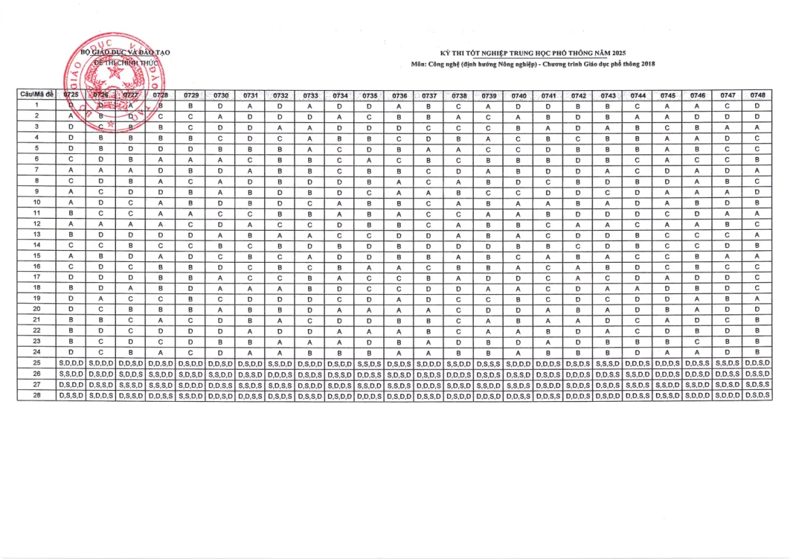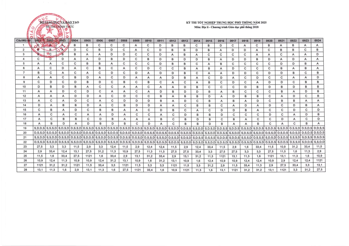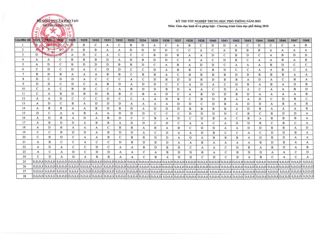 Cập nhật đáp án chính thức các môn thi Kỳ thi Tốt nghiệp THPT 2025 nhanh và chính xác nhất từ Bộ GD&ĐT. Tra cứu đáp án chi tiết từng môn: Toán, Văn, Anh, Lý, Hóa, Sinh, Sử, Địa,….