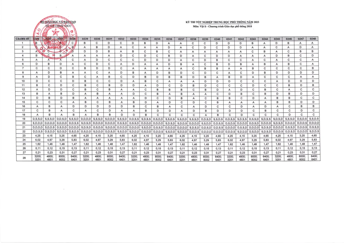Đáp án môn Vật Lý Kỳ thi Tốt nghiệp THPT 2025