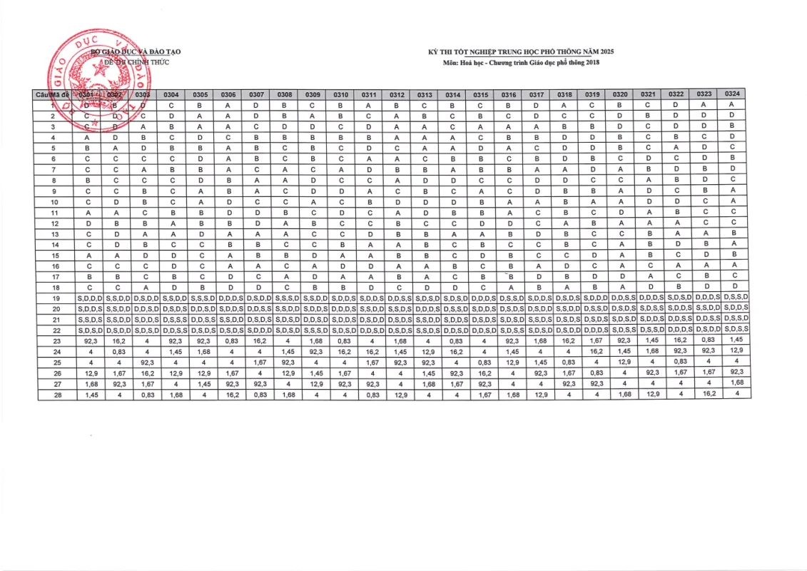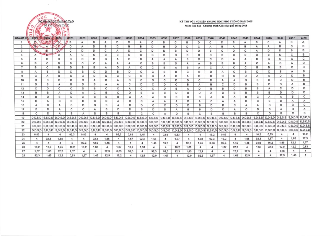 Đáp án môn Hóa Học Kỳ thi Tốt nghiệp THPT 2025