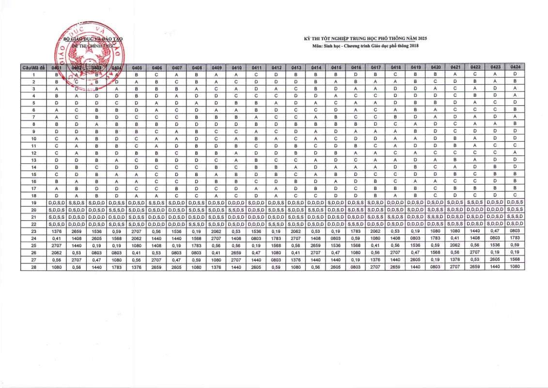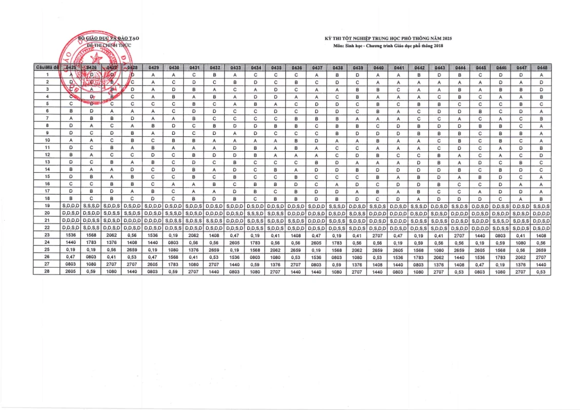 Đáp án môn Sinh Học Kỳ thi Tốt nghiệp THPT 2025
