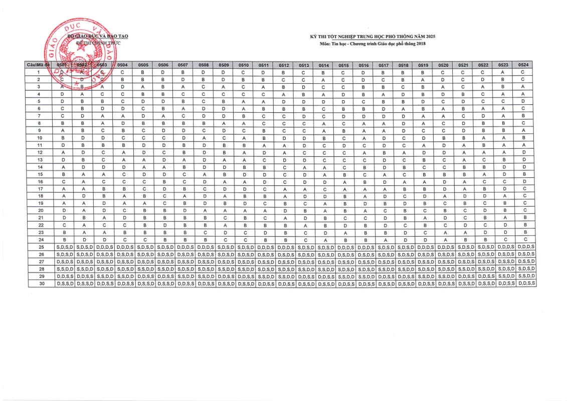 Đáp án môn Tin Học Tốt nghiệp THPT 2025