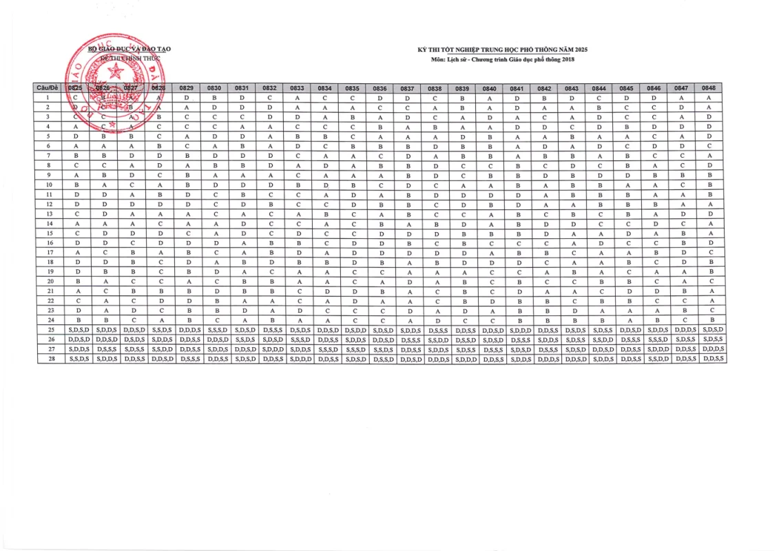 Đáp án môn Lịch Sử Kỳ thi Tốt nghiệp THPT 2025