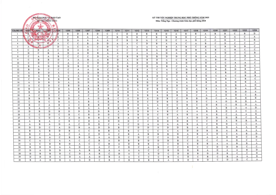 Đáp án môn Tiếng Nga TN THPT 2025
