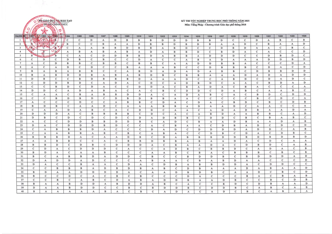 Đáp án môn Tiếng Pháp TN THPT 2025