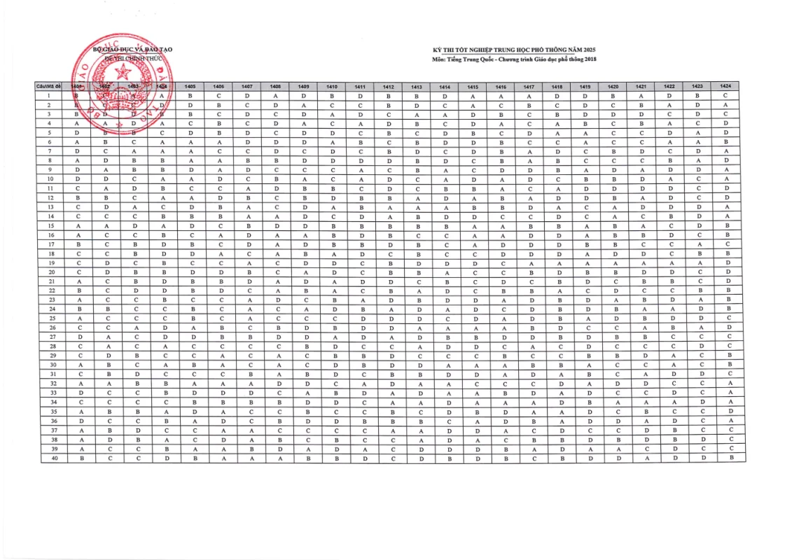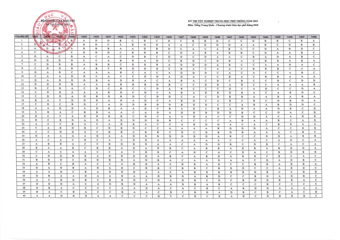 Đáp án môn Tiếng Trung TN THPT 2025