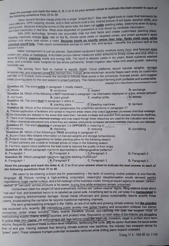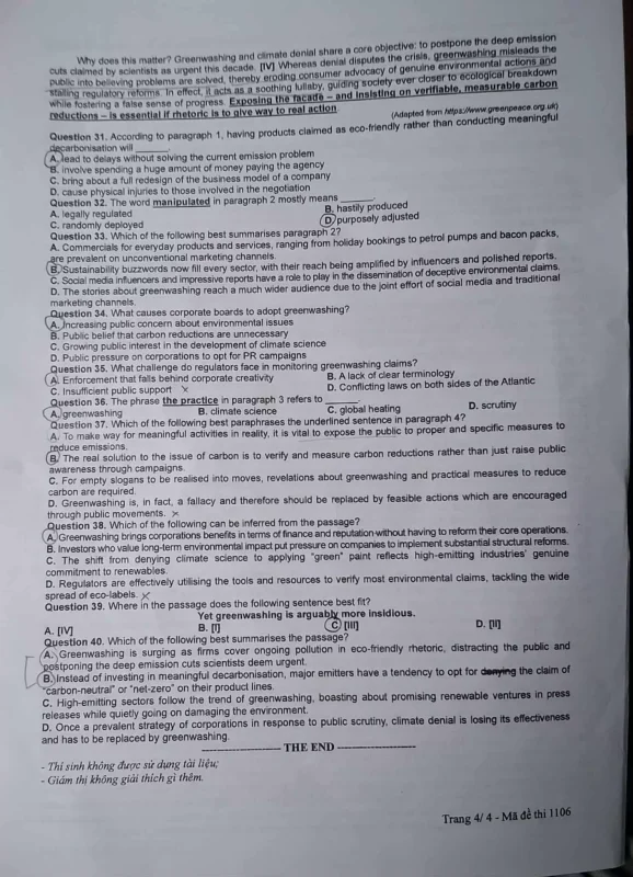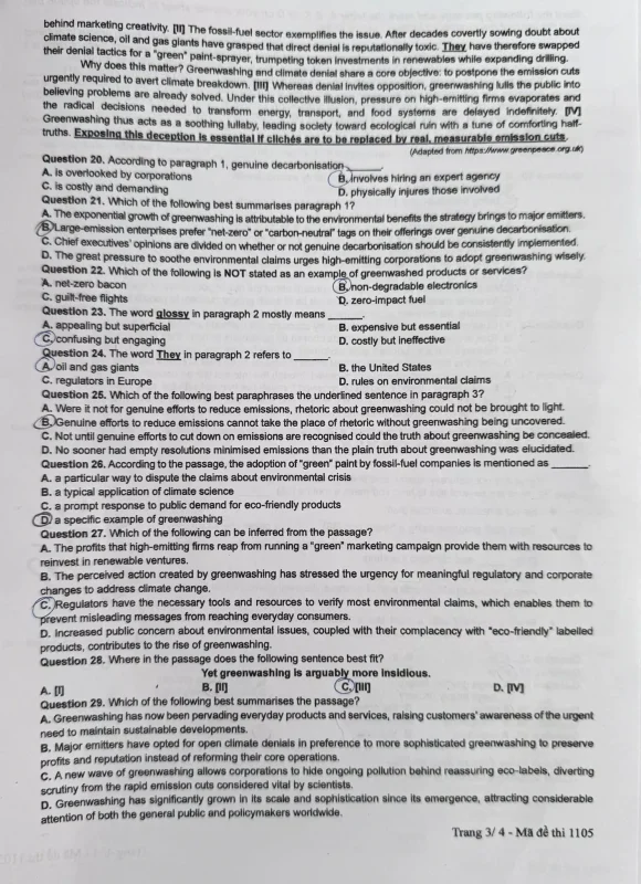 Question 29. Which of the following best summarises the passage? A. Greenwashing has now been pervading everyday products and services, raising customers’ awareness of the urgent need to maintain sustainable developments. B. Major emitters have opted for open climate denials in preference to more sophisticated greenwashing to preserve profits and reputation instead of reforming their core operations. C. A new wave of greenwashing allows corporations to hide ongoing pollution behind reassuring eco-labels, diverting scrutiny from the rapid emission cuts considered vital by scientists. D. Greenwashing has significantly grown in its scale and sophistication since its emergence, attracting considerable attention of both the general public and policymakers worldwide.