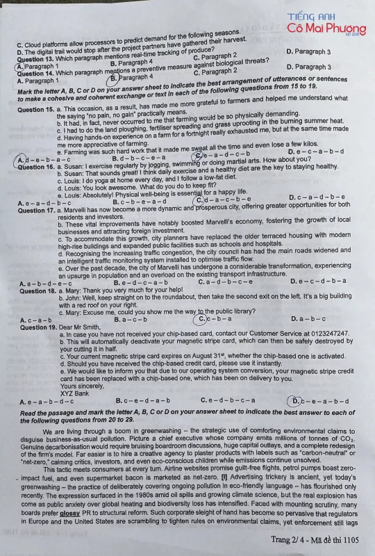 Question 15. a. This occasion, as a result, has made me more grateful to farmers and helped me understand what the saying ‘no pain, no gain’ practically means. b. In fact, it never occurred to me that farming would be so physically demanding. c. It had to be the land ploughing, fertiliser spreading, and grass uprooting in the burning summer heat. d. Having hands-on experience on a farm for a fortnight really exhausted me, but at the same time made me more appreciative of farming. e. Farming was such hard work that it made me sweat all the time and even lose a few kilos. A. d-e-b-c-a B. a-d-c-e-a C. a-d-b-c-e D. c-e-a-b-d