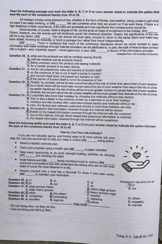 Question 30. A. what are the products will be certainly seeing directly B. until we certainly see its products directly C. being uncertain about the product until seeing it directly D. or a certain product to be seen directly Question 31. A. but do not present of risks and dangers to tourism itself B. so the presence of risk is not in itself a barrier to tourism C. yet, tourism itself does not present any barriers or risks D. if the barrier of tourism itself is not in the presence of risk Question 32. A. People, by contrast, will be far less concerned about the risk of crime than than about of poor weather B. as a result, there will be much less concerned about the risk of poor weather than about the risk of crime C. As earlier mentioned, the risk of crime will be of much greater concern to people than that of poor weather D. Similarly, the concern about the risk of poor weather will be much greater than that about the risk of crime Question 33. A. Customers also book their holidays by knowing the methods without risky factors B. Risk is also a factor in the methods chosen by customers to book their holiday C. Holidays are also booked after customers choose factors and methods without risk D. Also, the factors and methods customers choose to book their holidays are risky Question 34. A. the suspicion that information received through the Internet will be biased B. thanks to the biased information received through the Internet with the suspicion C. due to the Internet, through which biased and suspicious information is received D. the biased information received through the Internet will be suspicious