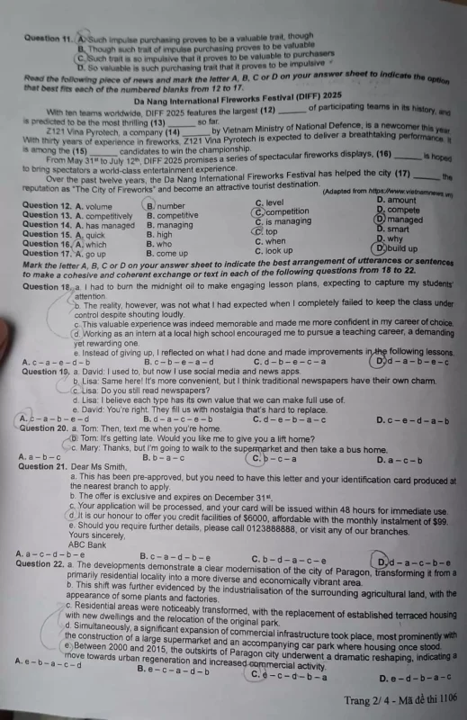 Question 17. a. MarvelI now has become a more dynamic and prosperous city, offering greater opportunities for both residents and investors. b. These vital improvements now nobody boosted MarvelI’s economy, fostering the growth of local businesses and attracting foreign investment. c. To accommodate the growth, city planners have replaced the older terraced housing with modern high-rise buildings and expanded public facilities such as schools and hospitals. d. Recognizing the increasing traffic congestion, the city council now has the main roads widened and an intelligent traffic monitoring system installed to optimise traffic flow. e. Over the past decade, the city of MarvelI has undergone a considerable transformation, experiencing its post-war in population and an overhaul in the existing transport infrastructure. A. a-b-d-e-c B. e-d-c-a-b C. a-d-b-c-e D. e-c-d-b-a