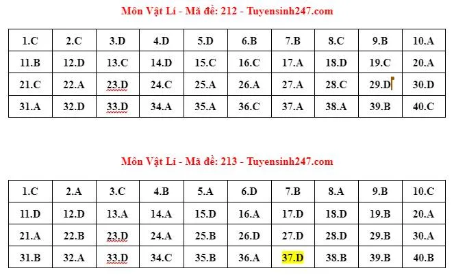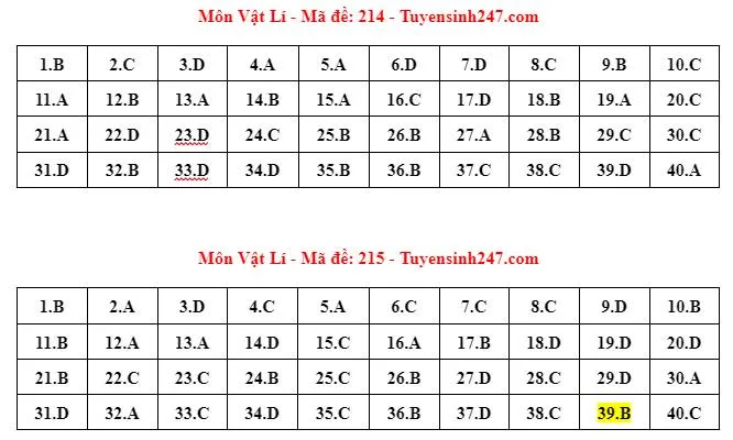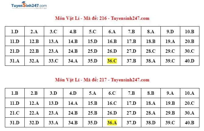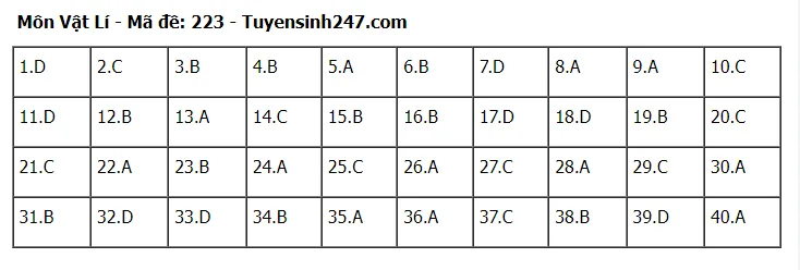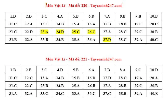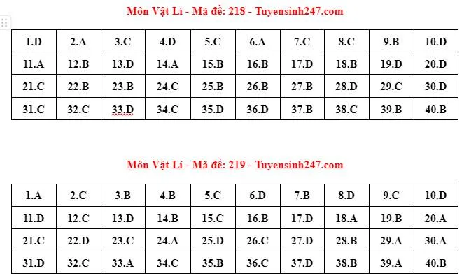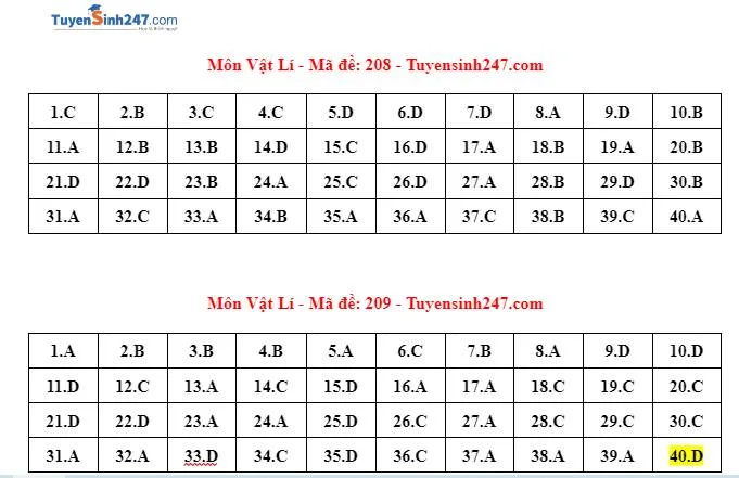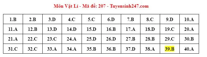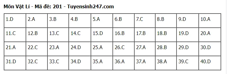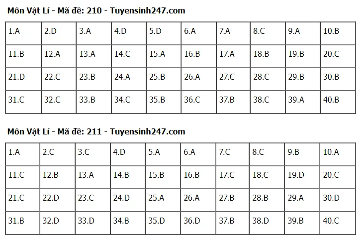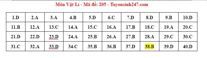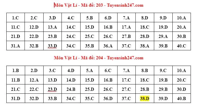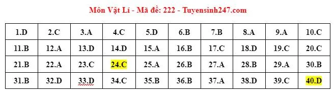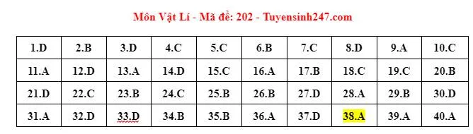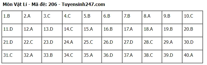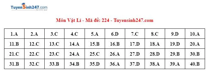 Dưới đây là tổng hợp đáp án đề thi tốt nghiệp THPT môn Vật lý 2024 do Tuyensinh247.com thực hiện, chưa phải đáp án chính thức của Bộ giáo dục nên vẫn có thể có sai sót, chỉ mang tính chất tham khảo nhé.
