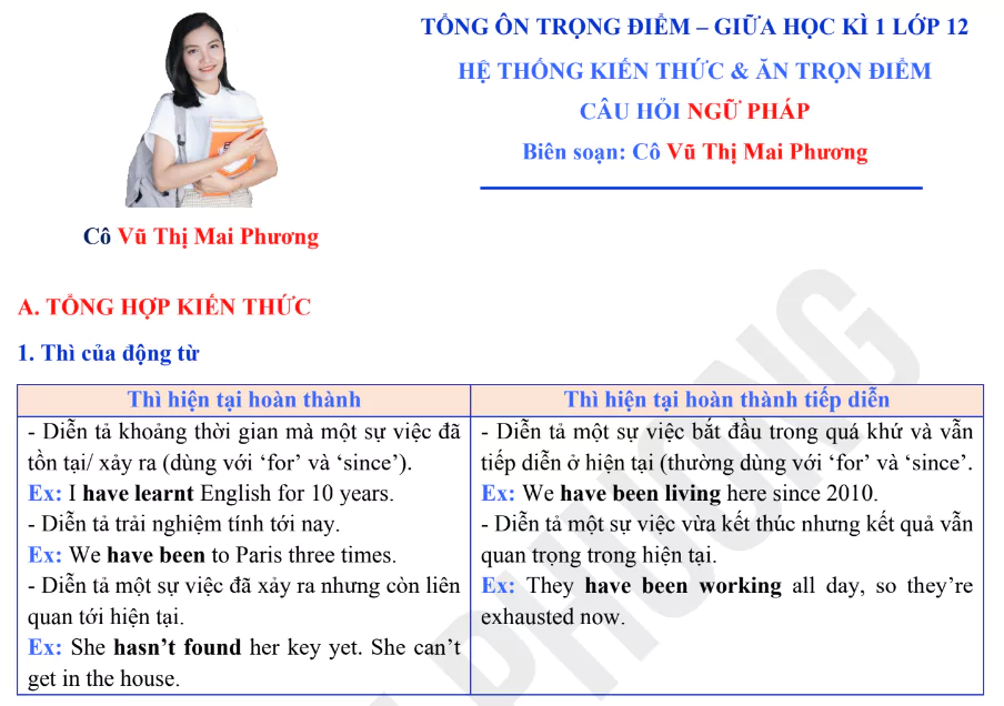 Tải tài liệu Tổng ôn Ngữ pháp giữa học kỳ 1 lớp 12 – Cô Mai Phương